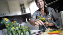 Hon har även samarbete med Nils Olsson Dalahästar AB där hon designar och tar fram nya typer av dalahästar, bl.a ”Årshästen” men målar även de traditionella dalahästarna.