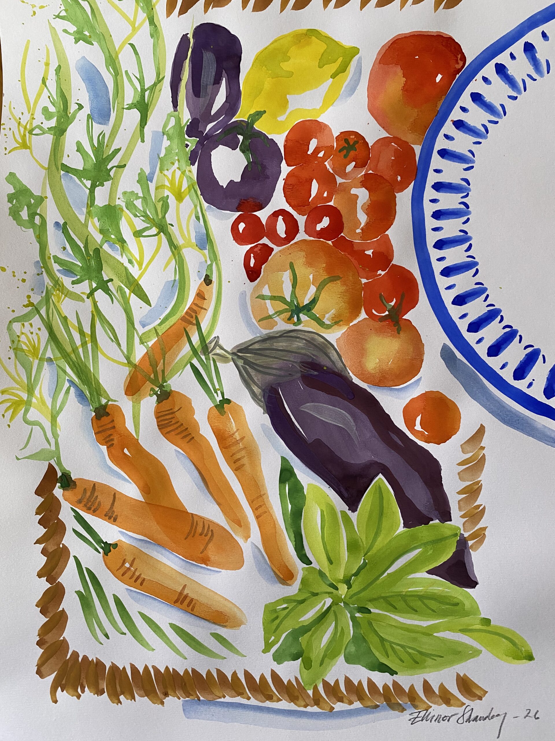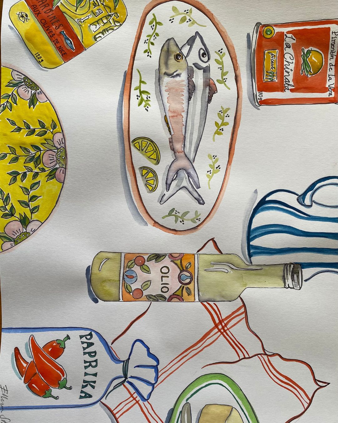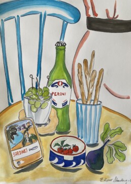 Jag målar gärna lekfulla motiv med inspiration från medelhavets mat, färger och liv. Motiven växer fram under måleriets gång utan någon egentlig plan, istället får färg, form och känsla styra. Jag gillar när det får vara löst, färgstarkt och lite ojämnt där penseldragen syns. I mitt arbete använder jag vanlig vattenfärg och varierar mig med att jobba med färgen som akvarell, tillsammans med tusch eller mer täckande.