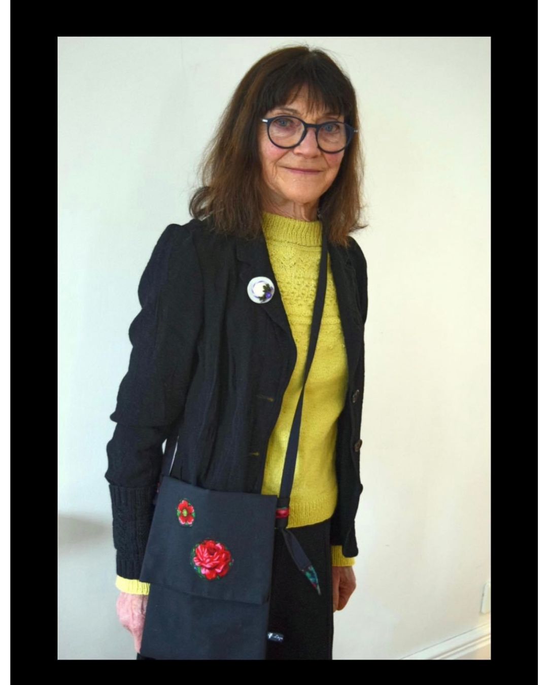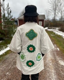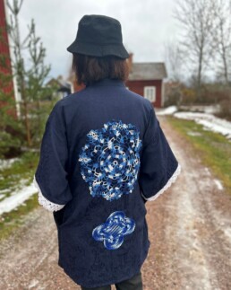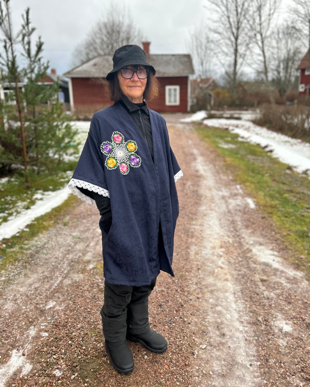 Nyss fyllda 80 och symaskinen går fortfarande varm. Att återbruka med riktigt material såsom lin, bomull och ull är både avkopplande och inspirerande. Vetskapen att väcka liv i ”gammal kvinnokraft” fyller mig med livsglädje. Materialet, mönster och storlek på ”tyget” tycks visa mig vad det kan bli. Och det blir till både förkläden, necessärer och väskor i olika storlekar och varianter. Nytt för i år, Kimonos med applikationer av virkade och broderade dukar.